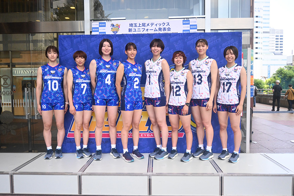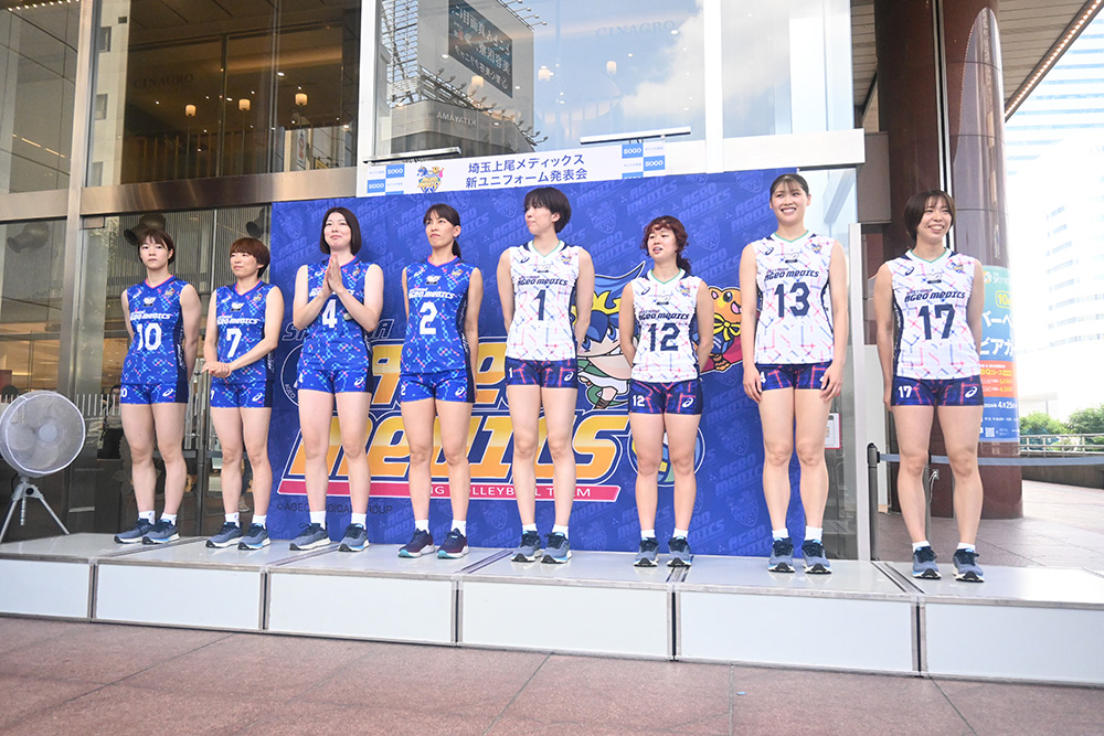 埼玉上尾メディックスから山中宏予選手、岩崎こよみ選手、濵松明日香選手、山岸あかね選手、佐藤優花選手、岩澤実育選手、黒後愛選手、鎌田咲希選手が新ユニフォームを着用して登壇いたしました。