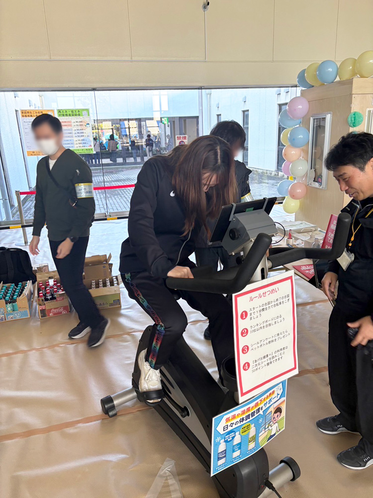 上尾市ゼロカーボン推進室様の体験ブースにて発電機付きエアロバイクの井上が体験をしました。