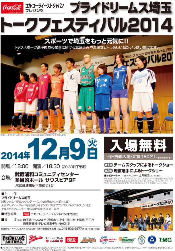 12月9日(火)に武蔵浦和コミュニティセンターにて開催されます『プライドリームス埼玉 トークフェスティバル2014』に埼玉上尾メディックスの選手・スタッフが参加致します。