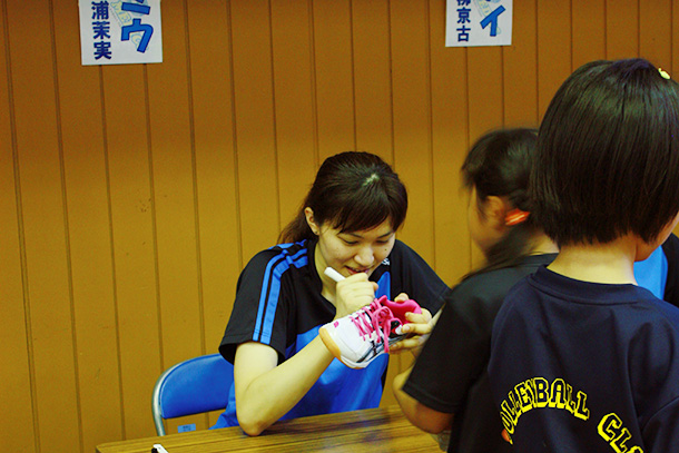 教室では毎回恒例となってきましたスパイクレシーブ体験では沢山の挑戦者がコートいっぱいに広がって小笹選手と辺野喜選手のスパイクを直接体験しました。