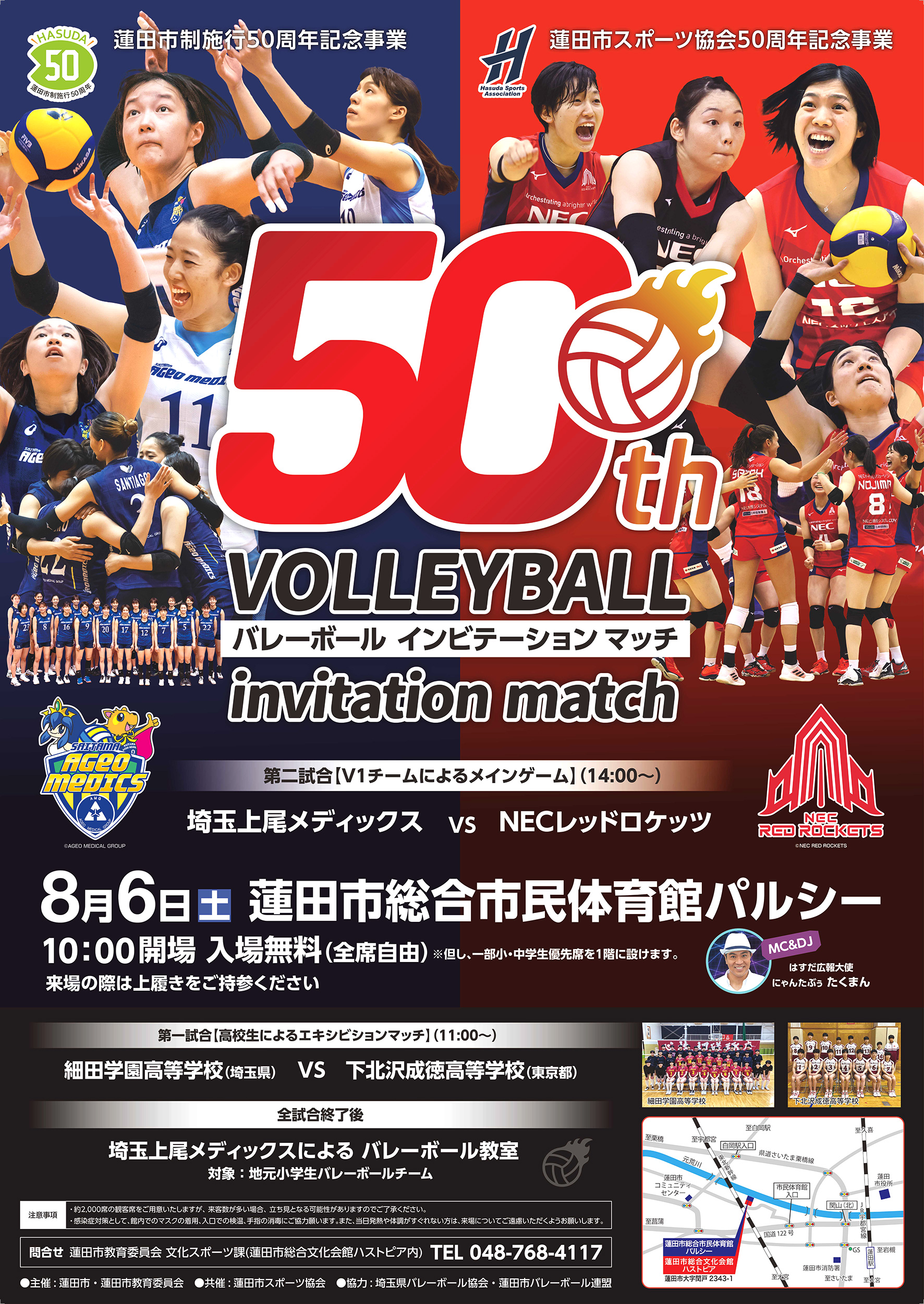 8月6日(土)に埼玉県蓮田市の蓮田市総合体育館パルシーにて蓮田市制施行50周年事業 蓮田市スポーツ協会50周年記念事業 バレーボールインビテーションマッチが行われます。会場では肉汁うどんやお弁当などの販売も行います!是非会場にお越しください!