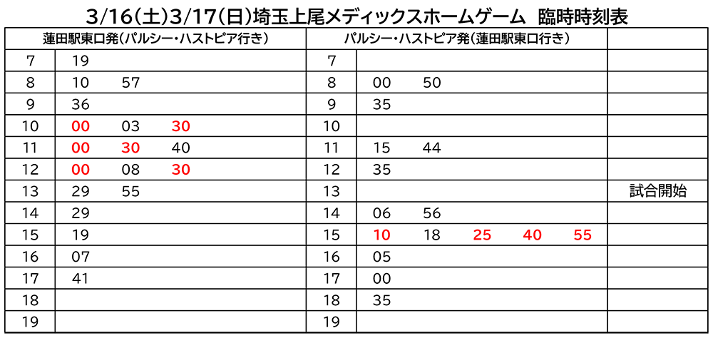3月16日(土)、17日(日)に蓮田市総合市民体育館パルシーにて開催されます埼玉上尾メディックスホームゲームにて、蓮田市総合市民体育館直通便(朝日バス)を増便致します