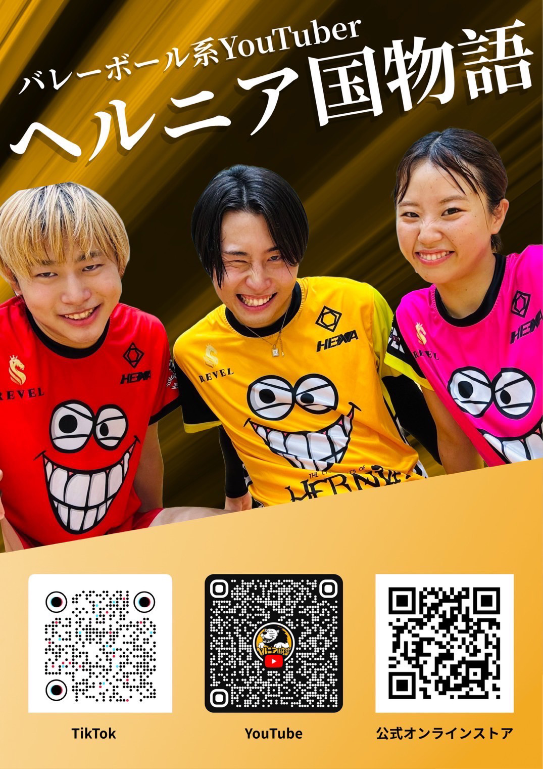 バレーボールをやったことがない人でも楽しめるバレー動画を毎日、YouTubeやInstagram、TikTokで配信しています。会場では、ヘルニア国物語プロデュースブランド「REVEL-ルヴェル」も販売予定です!