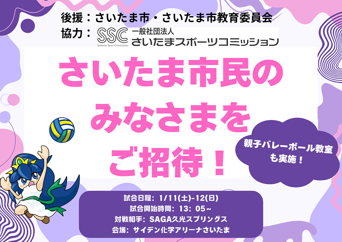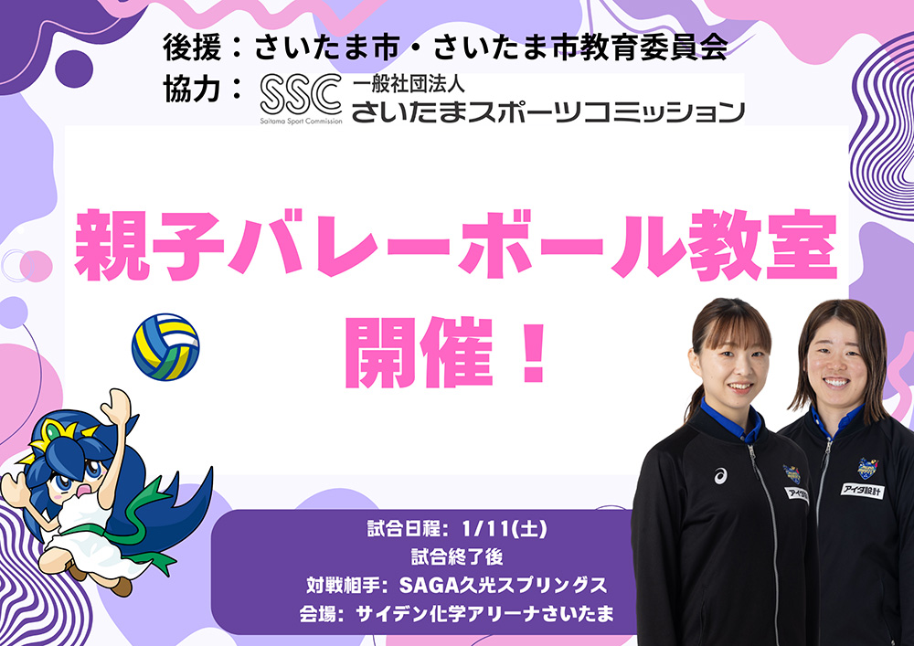 1月11日(土)に、サイデン化学アリーナさいたまにて開催されます、2024-25大同生命SV.LEAGUE WOMENレギュラーシーズン第12節 埼玉上尾メディックス vs SAGA久光スプリングスの試合終了後に、さいたま市・さいたま市教育委員会後援、一般社団法人さいたまスポーツコミッション協力のもと、親子バレーボール教室を開催いたします。