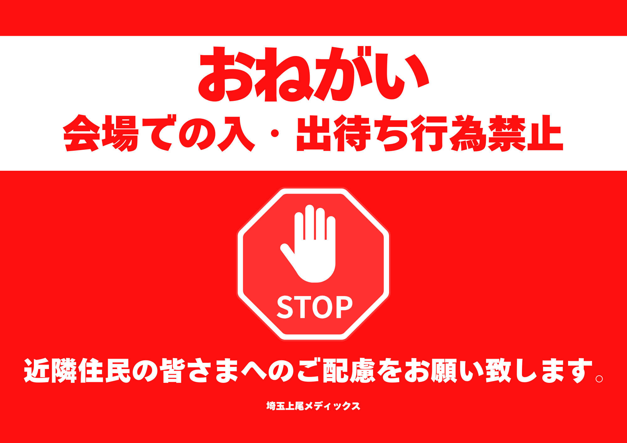 東松山市民体育館は、住宅街の中にある施設のため、近隣住民への迷惑行為防止や、ご来場の皆様ならび出場選手への安全管理上、お客様の出待ち行為ならびにお見送り行為を一切禁止とさせていただきます。ご理解のほど、宜しくお願い申し上げます。