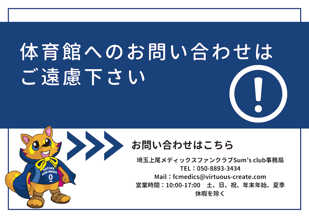 ※体育館へのお問合せはご遠慮願います。本件に関するお問合せについては、ファンクラブ事務局までお問合せください。