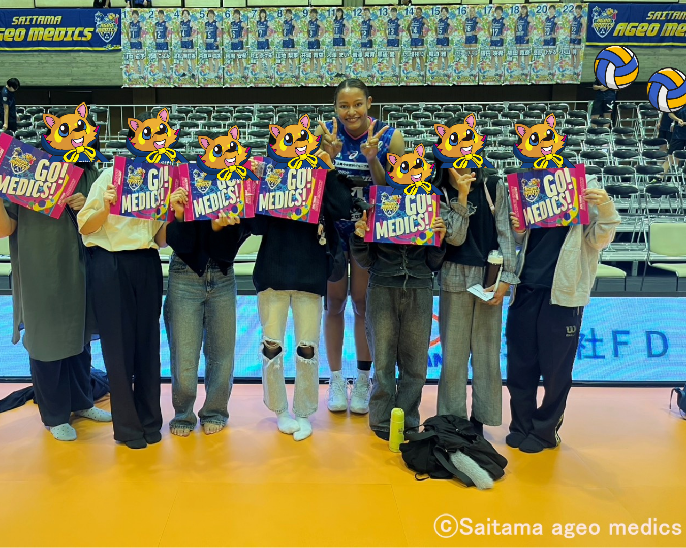 試合後にはハウィ選手への質問タイムを実施したり、コートで記念撮影をしたほか、サプライズでハウィ選手からの「Furaha seat」オリジナルキーホルダーをプレゼントするなど、参加された皆様に埼玉上尾メディックスのホームゲームをお楽しみにいただきました。