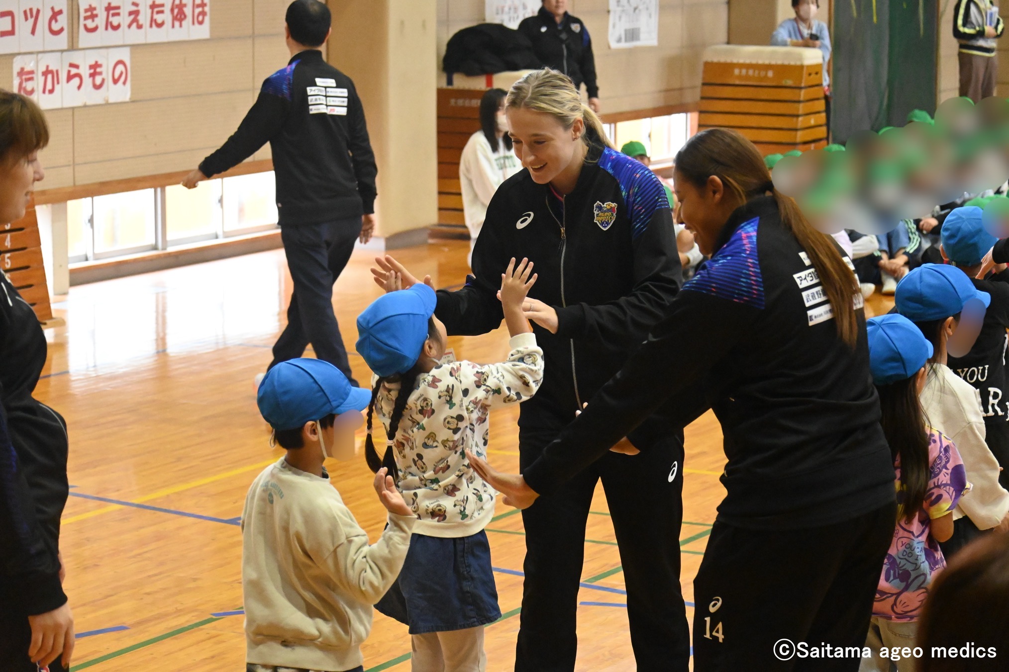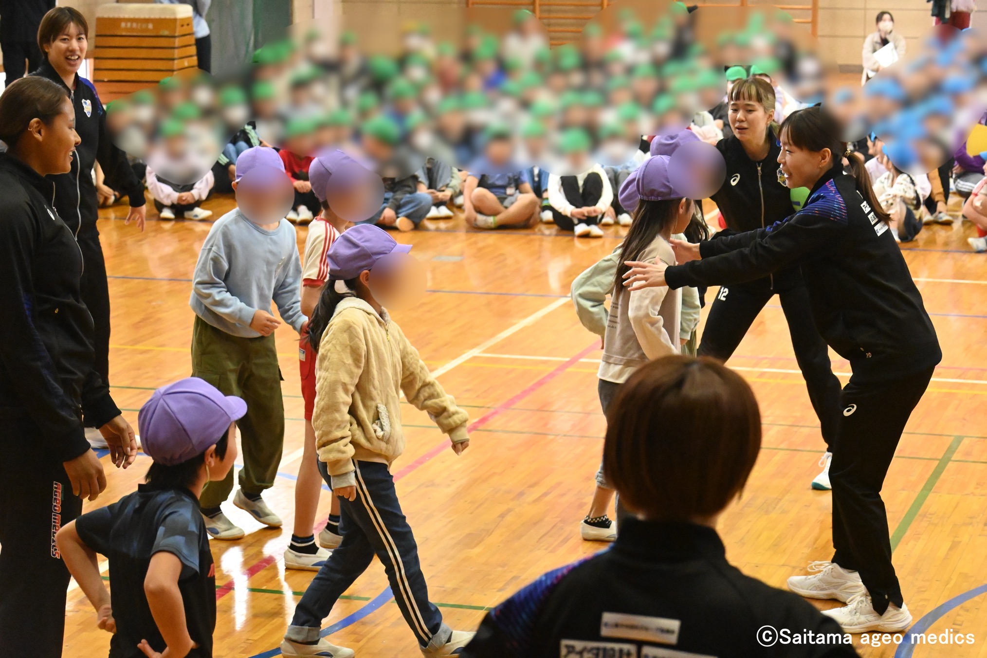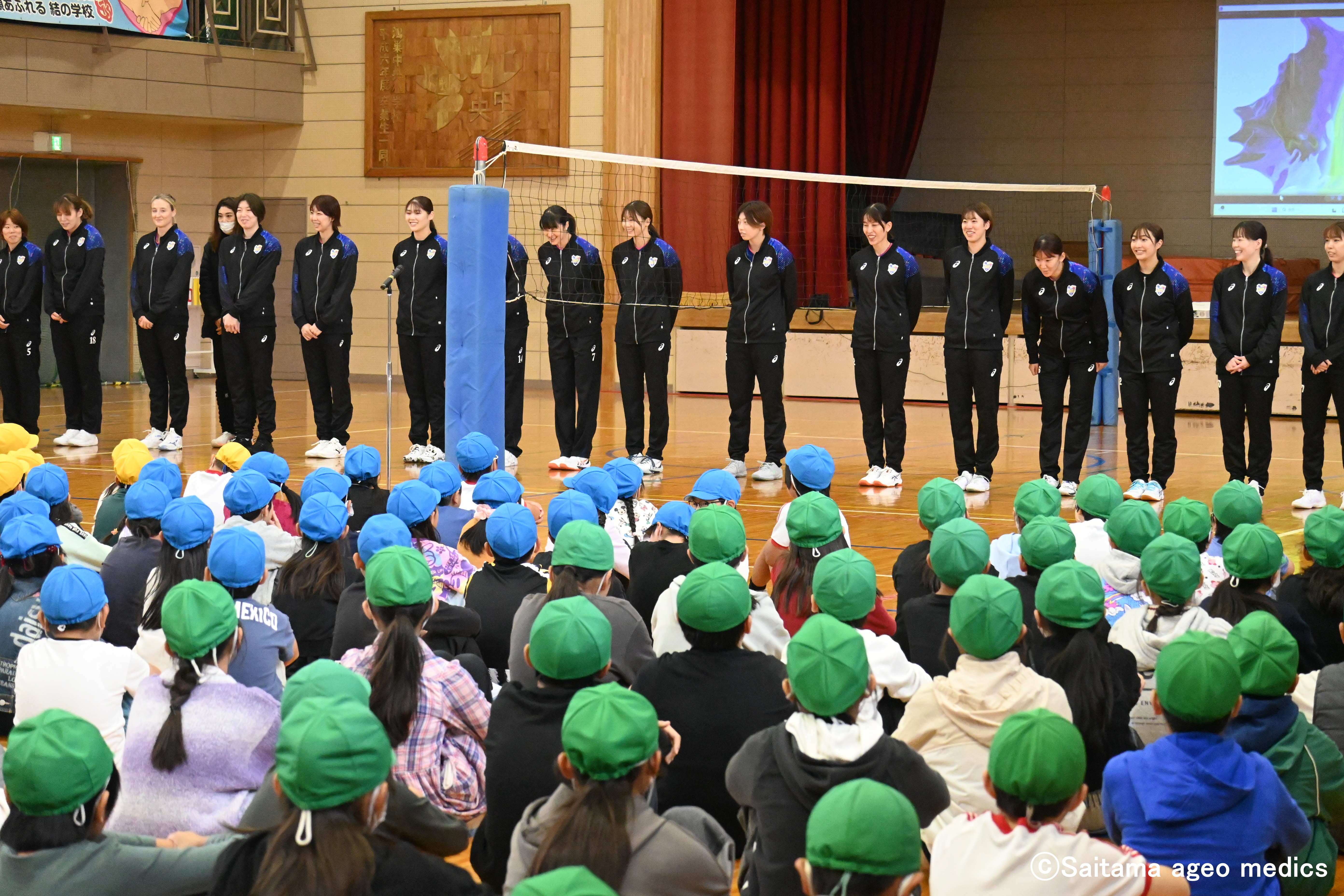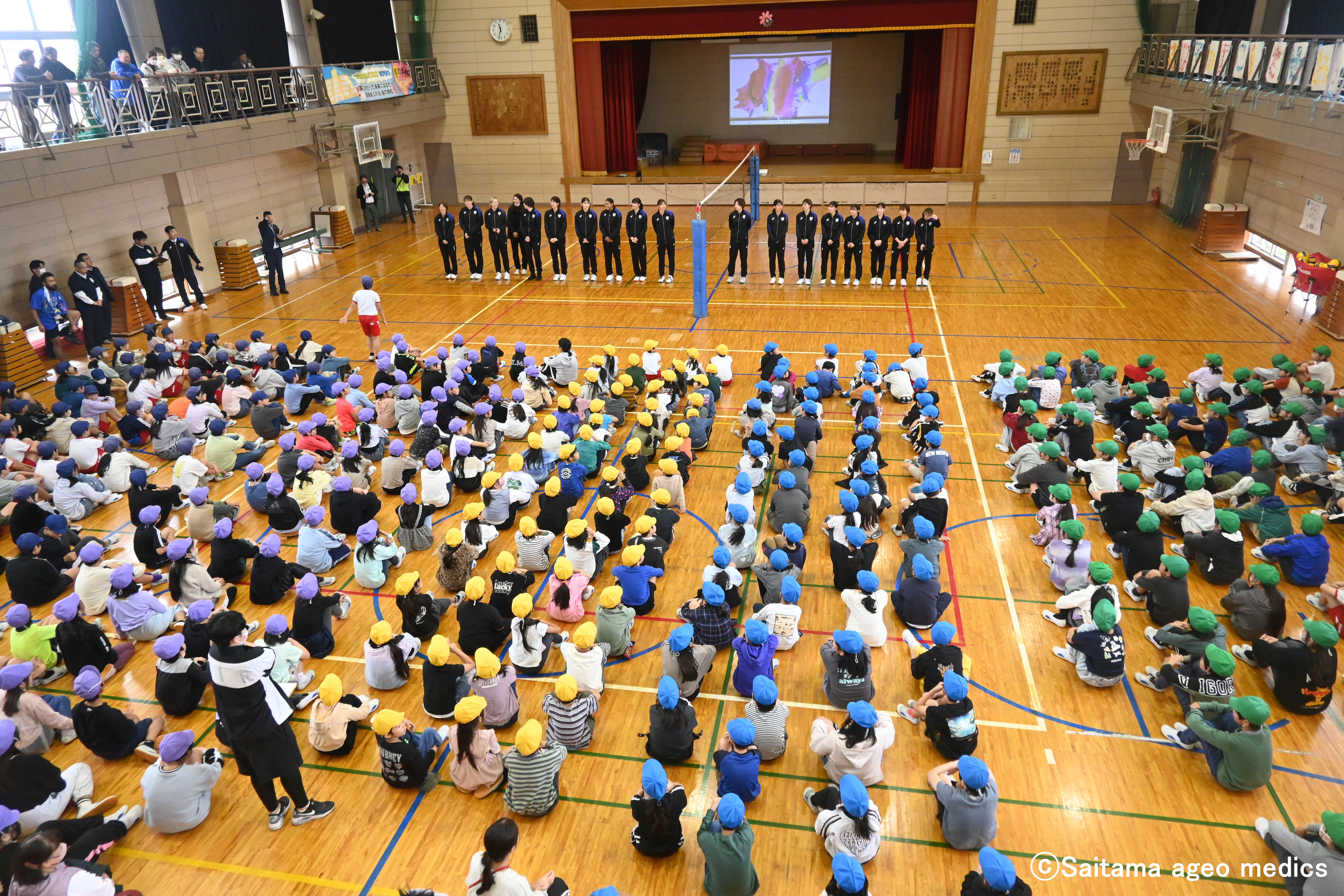メディックスパートナーである、埼玉りそな銀行の埼玉りそな銀行様の寄贈型CSR私募債で、ハサミ・板金機械工具総合メーカーの株式会社直徳様が鴻巣中央小学校の児童全員にソフトバレーボールとノート、クリアファイルを寄贈しました。また、株式会社直徳様から「子どもたちに本物に触れる機会を提供したい」という声に応え、埼玉上尾メディックス選手による交流会も実施されました。