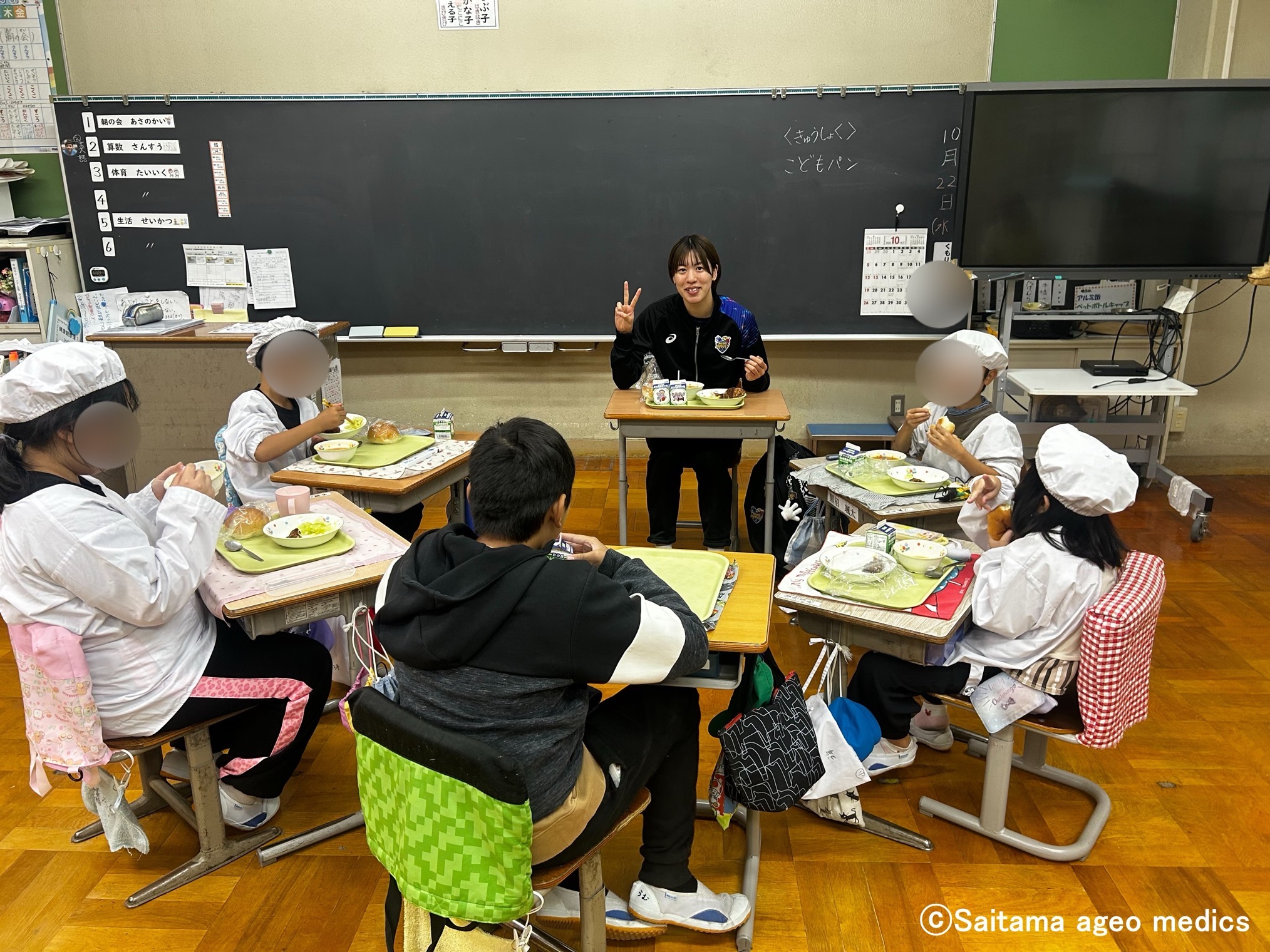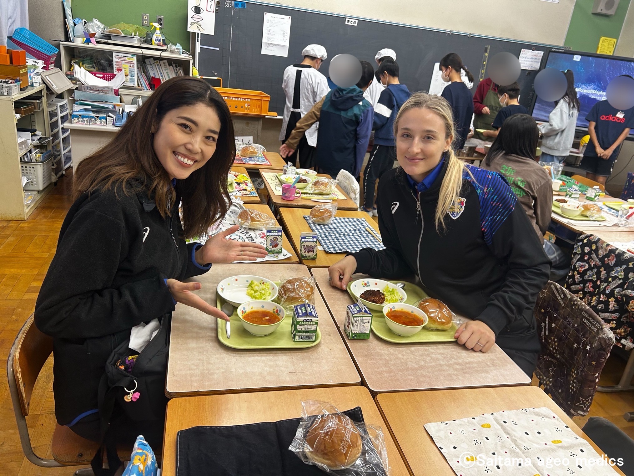 体験会を終えると、選手を各クラスに招待していただき質問タイムのあと、(子供たちと)一緒に給食をいただきました。