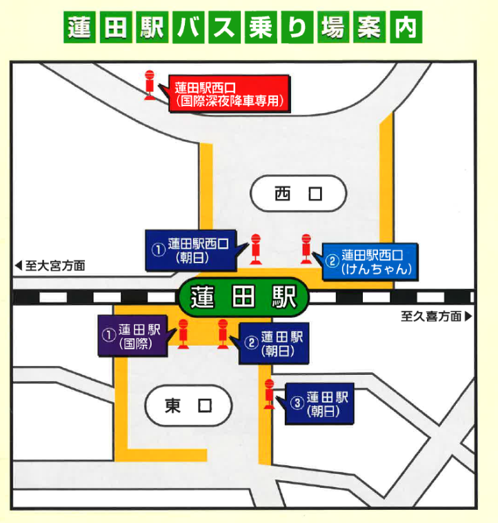 下記の通り、蓮田駅東口(3番バス乗場)より運行いたしますので、ぜひご利用ください!