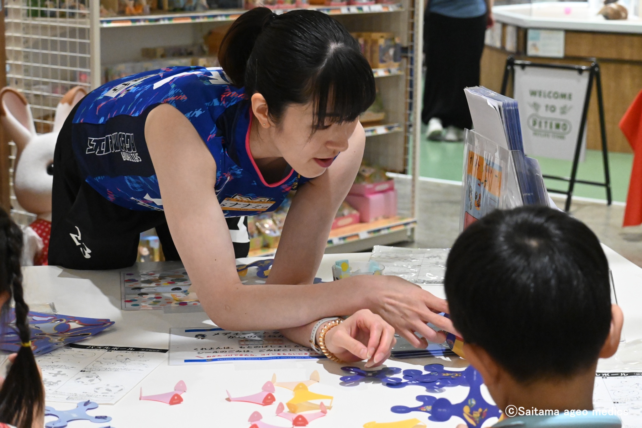埼玉上尾メディックスのマスコットキャラクターの塗り絵やシール貼り、パズルボールの作成が出来るワークショップを行いました。