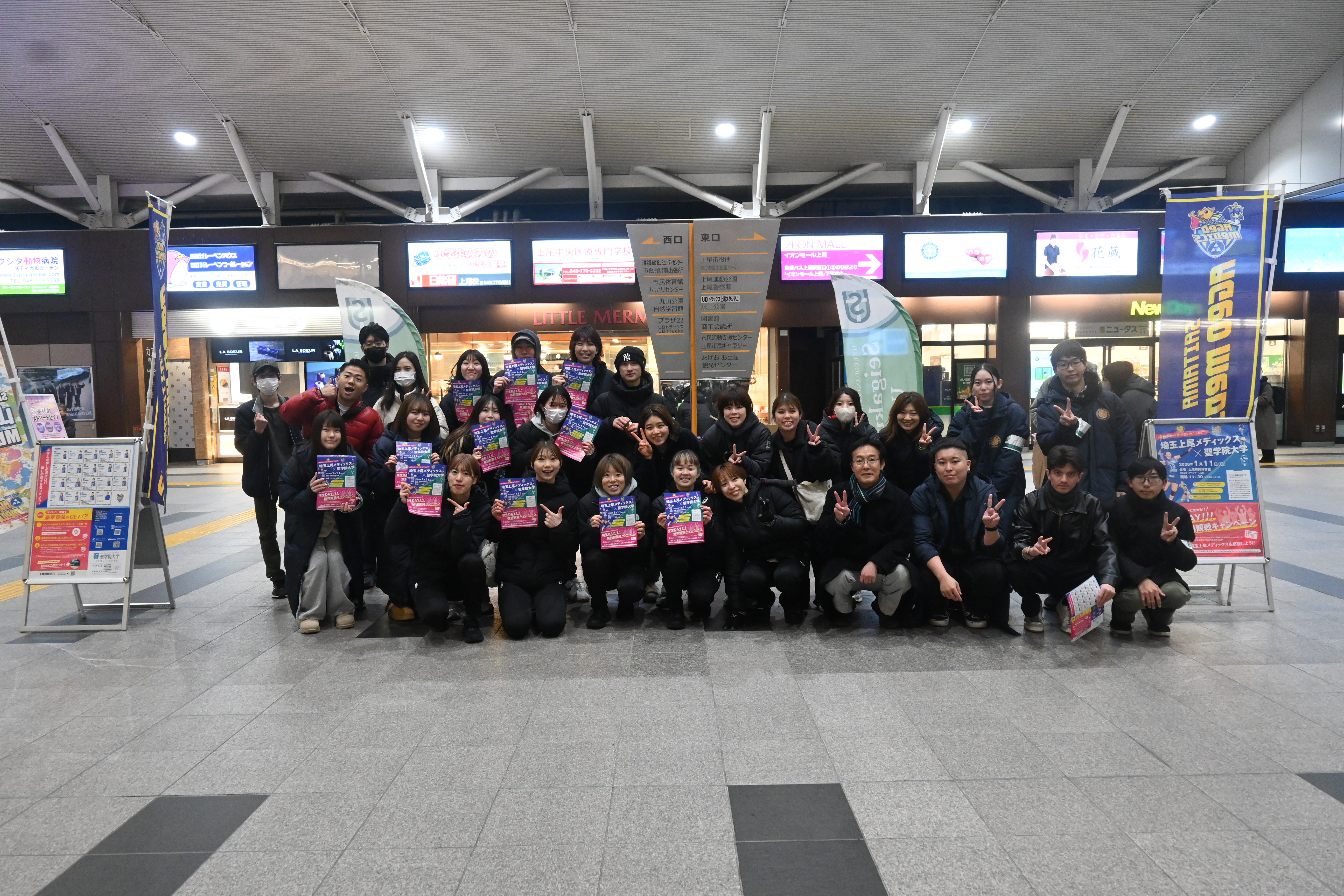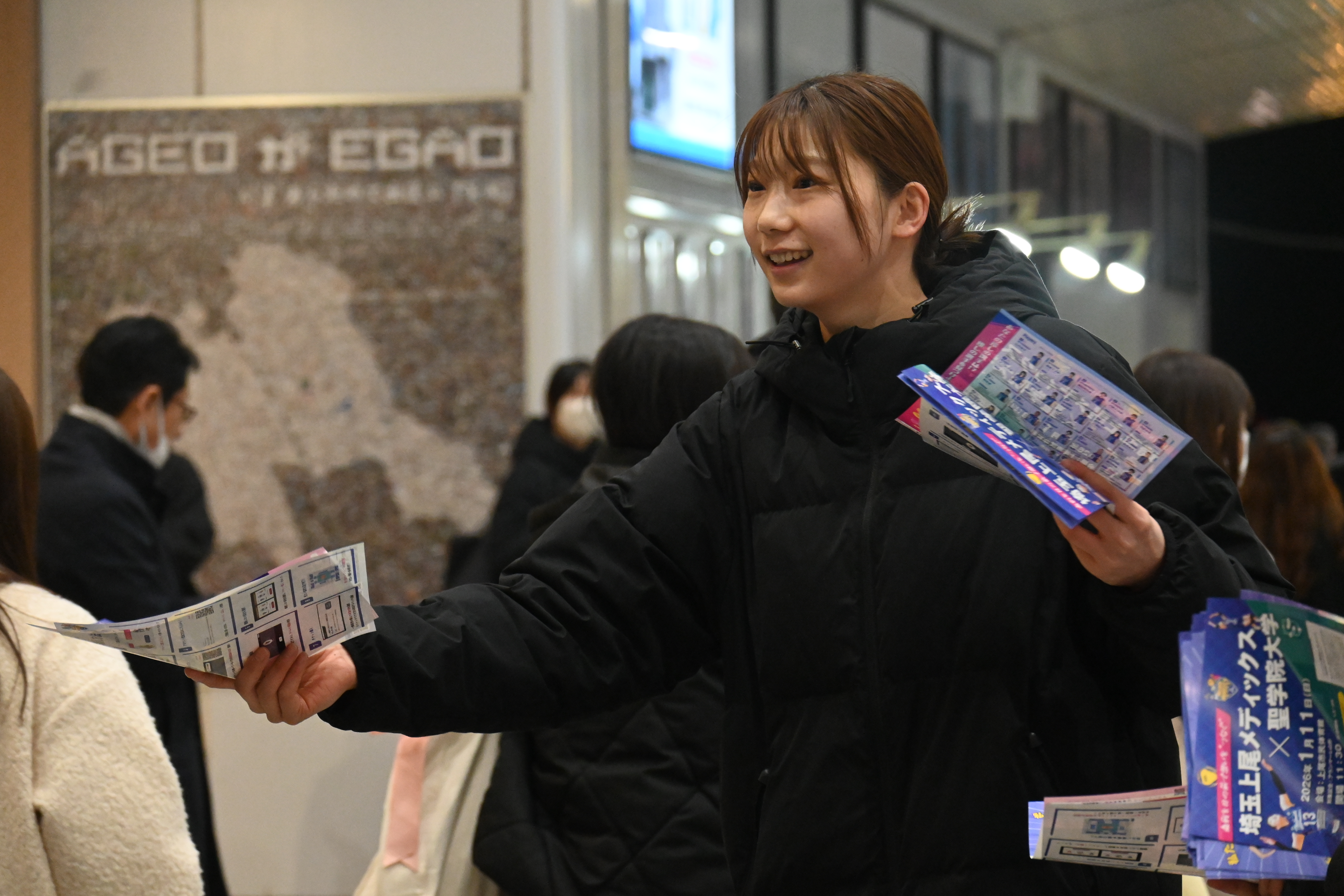 PR活動として聖学院大生と選手が12月22日夕方に一緒にチラシ配りを行いました!