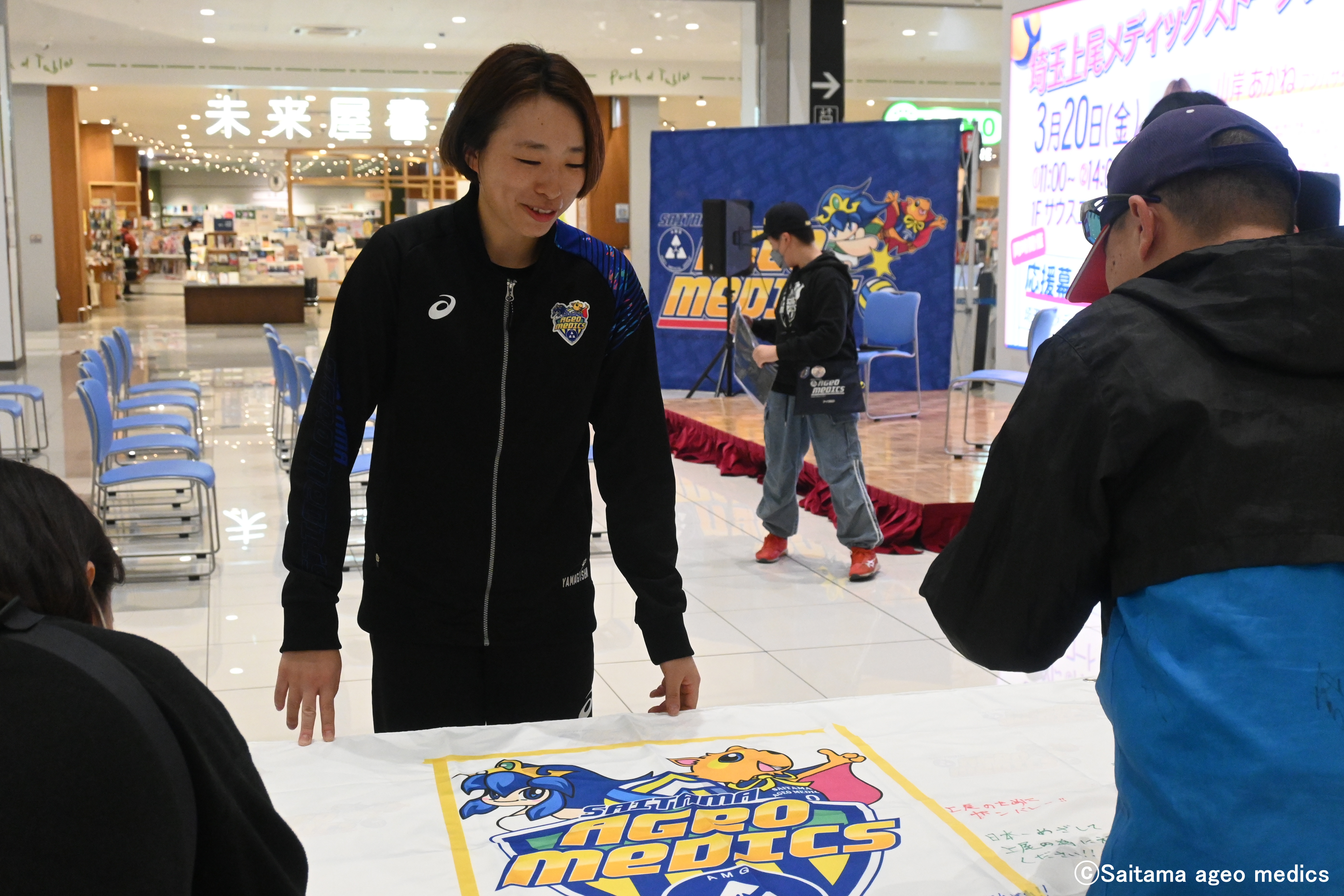 トークショー後は、同会場で実施していた「応援幕メッセージワークショップ」に山岸アンバサダーも参加したくさんの方に、(埼玉上尾メディックスへの)応援メッセージを書いていただきました。