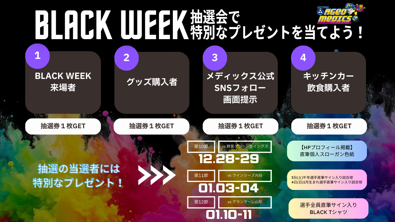 試合終了後に抽選を行い、各日3名様にはBLACK WEEK限定プレゼントがあたる!