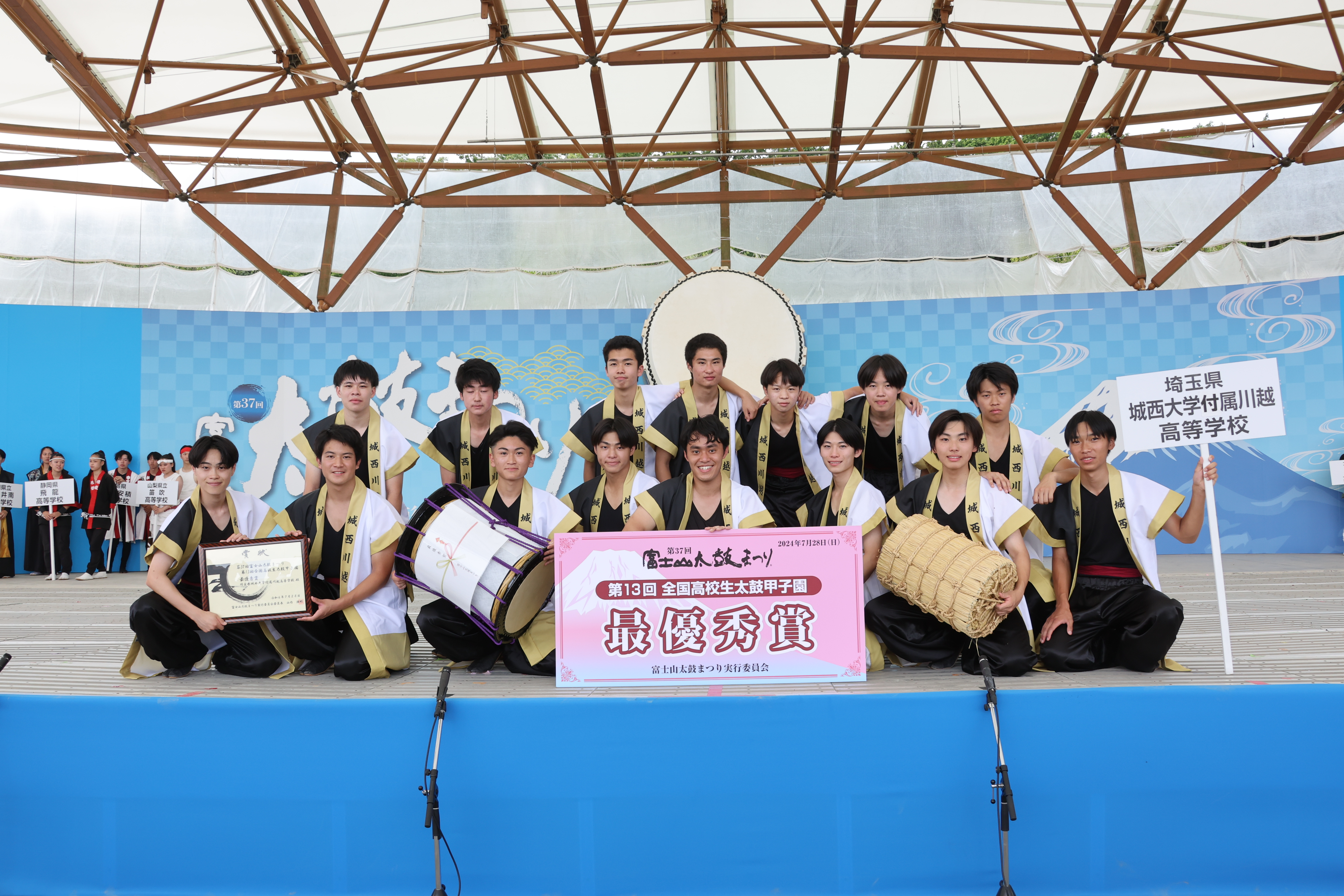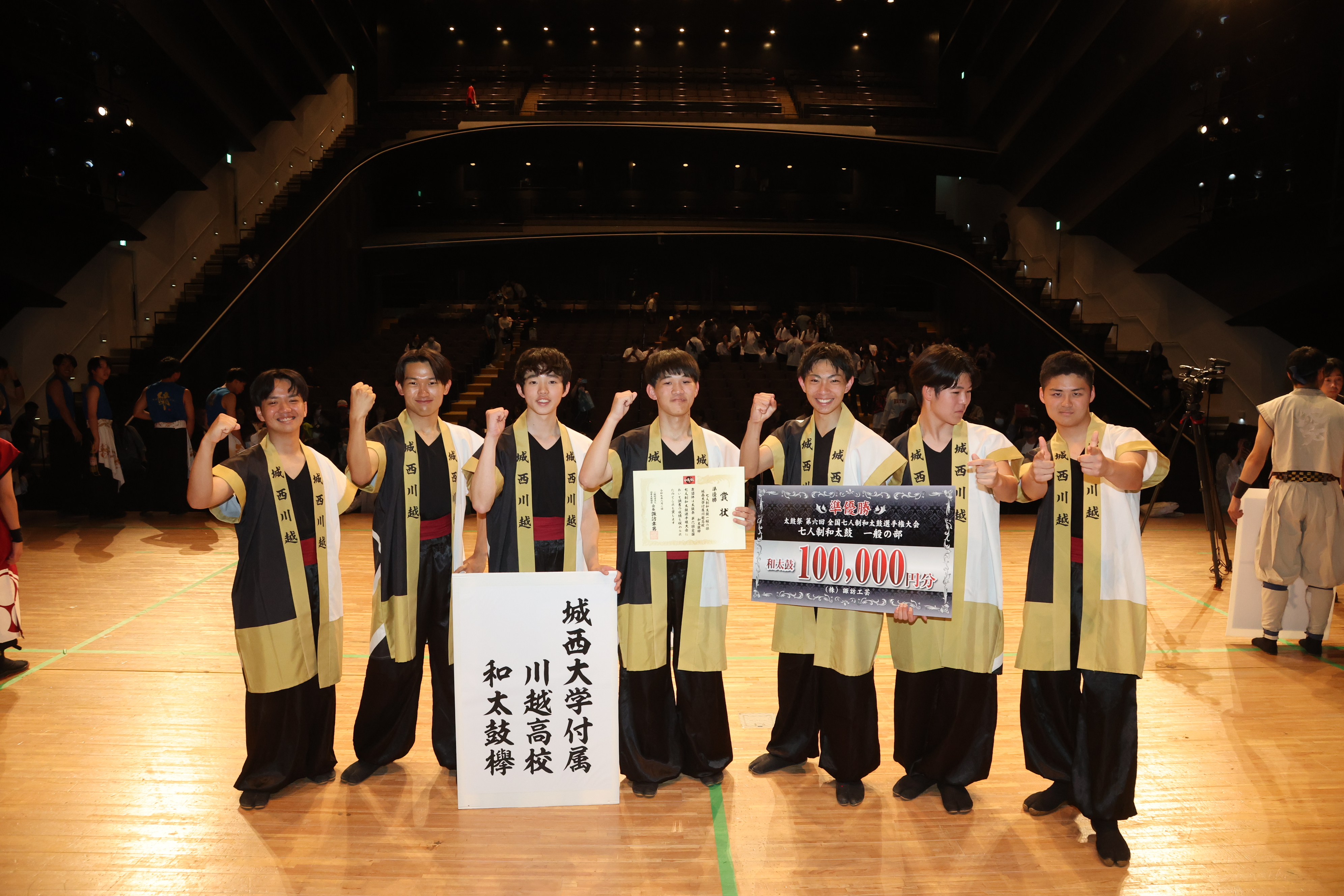 また、昨年5 月26 日(日)開催の第5 回全国七人制和太鼓選手権大会の一般の部で優勝し、創部初の全国大会初優勝となりました。さらに、昨年7 月28 日(日)開催の第13 回全国高校生太鼓甲子園で最優秀賞を受賞し、高校和太鼓三大全国大会の一つを制覇することができました。