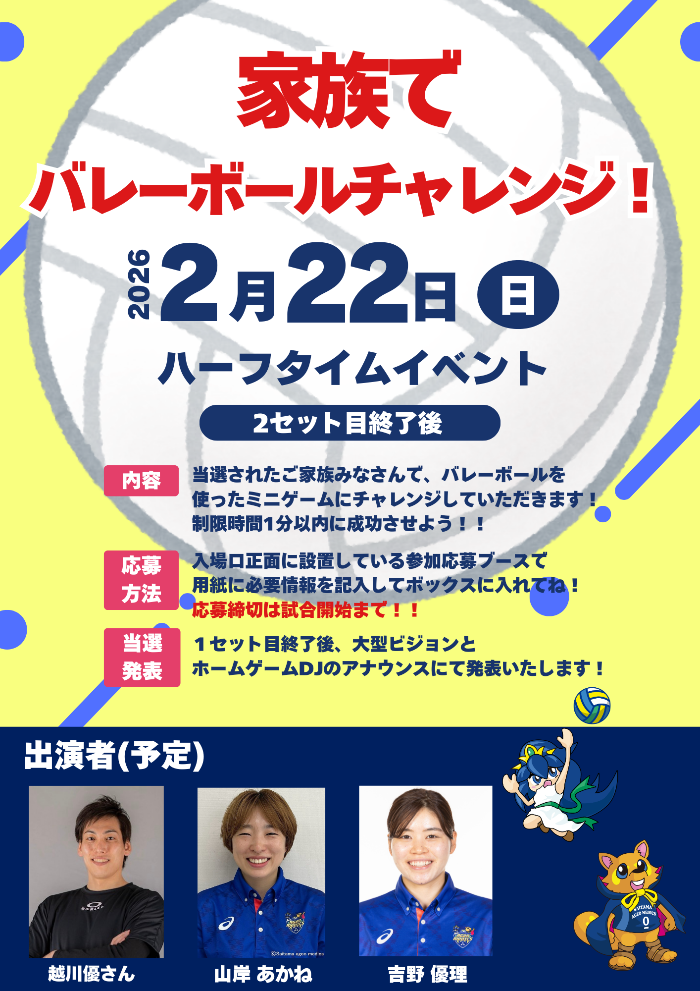 🏐2/22(日)ハーフタイムイベント 「家族でバレーボールチャレンジ」&越川優さんによるサインボール投げ込み