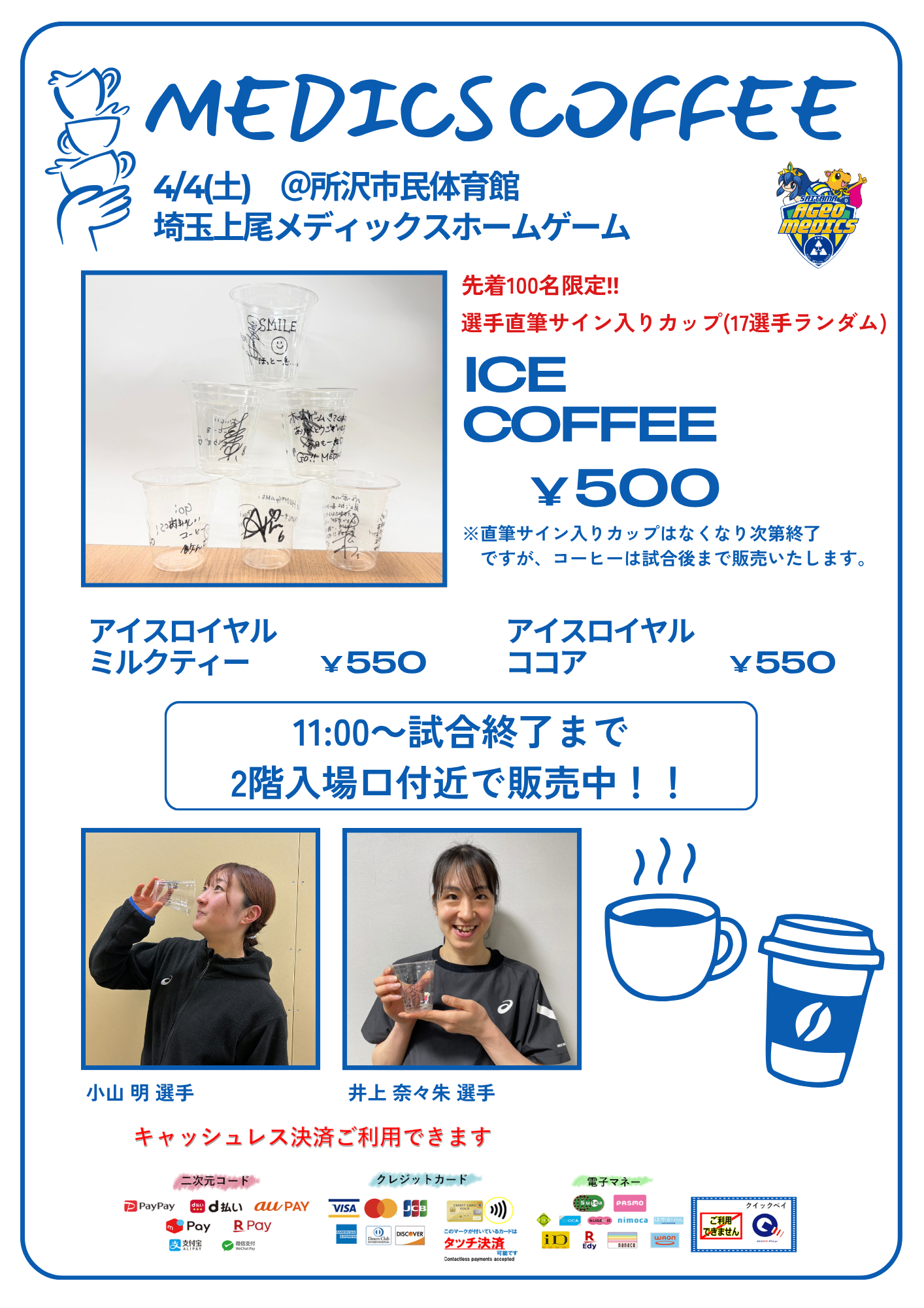 🏐4/4(土) 選手の直筆サイン入りカップコーヒーを先着100名に販売!!