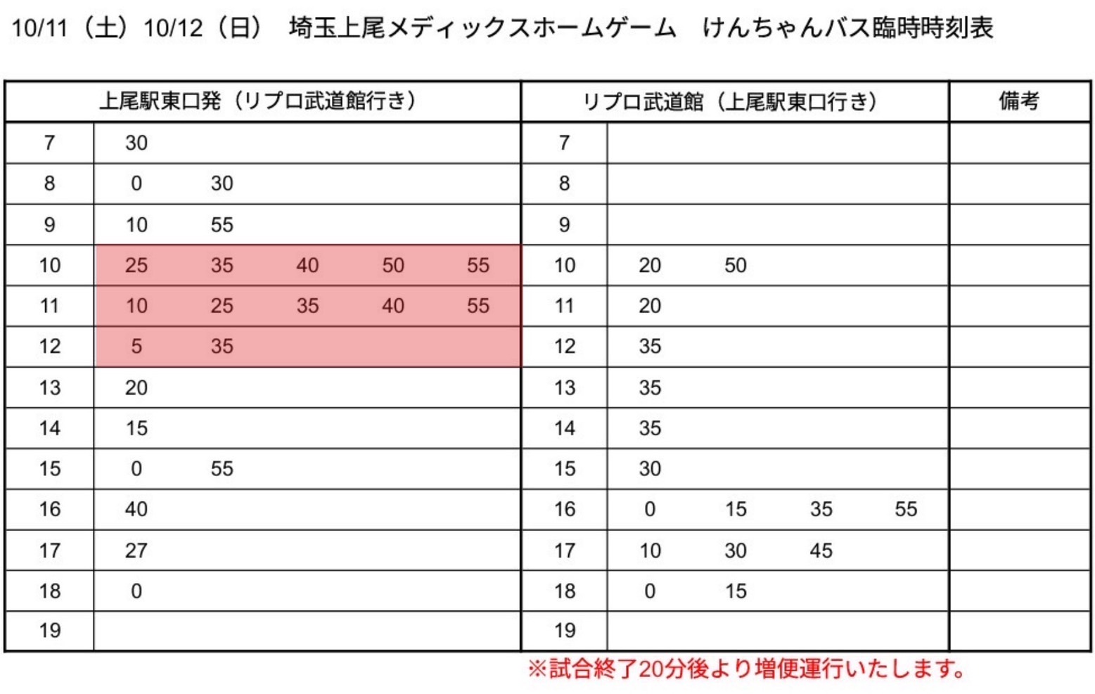 10月11日(土)、12(日)リプロ武道館直通便(けんちゃんバス)の増便のお知らせ