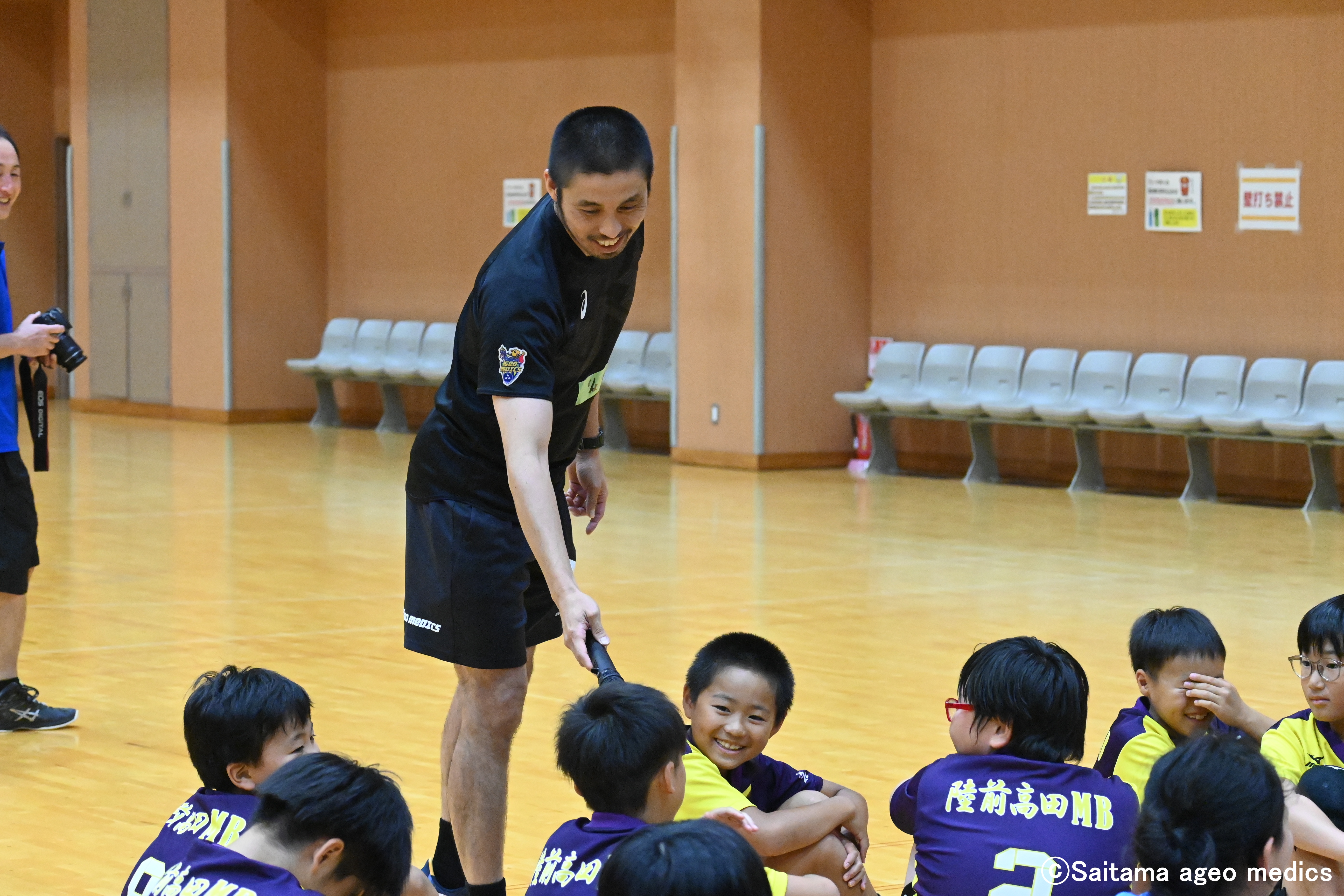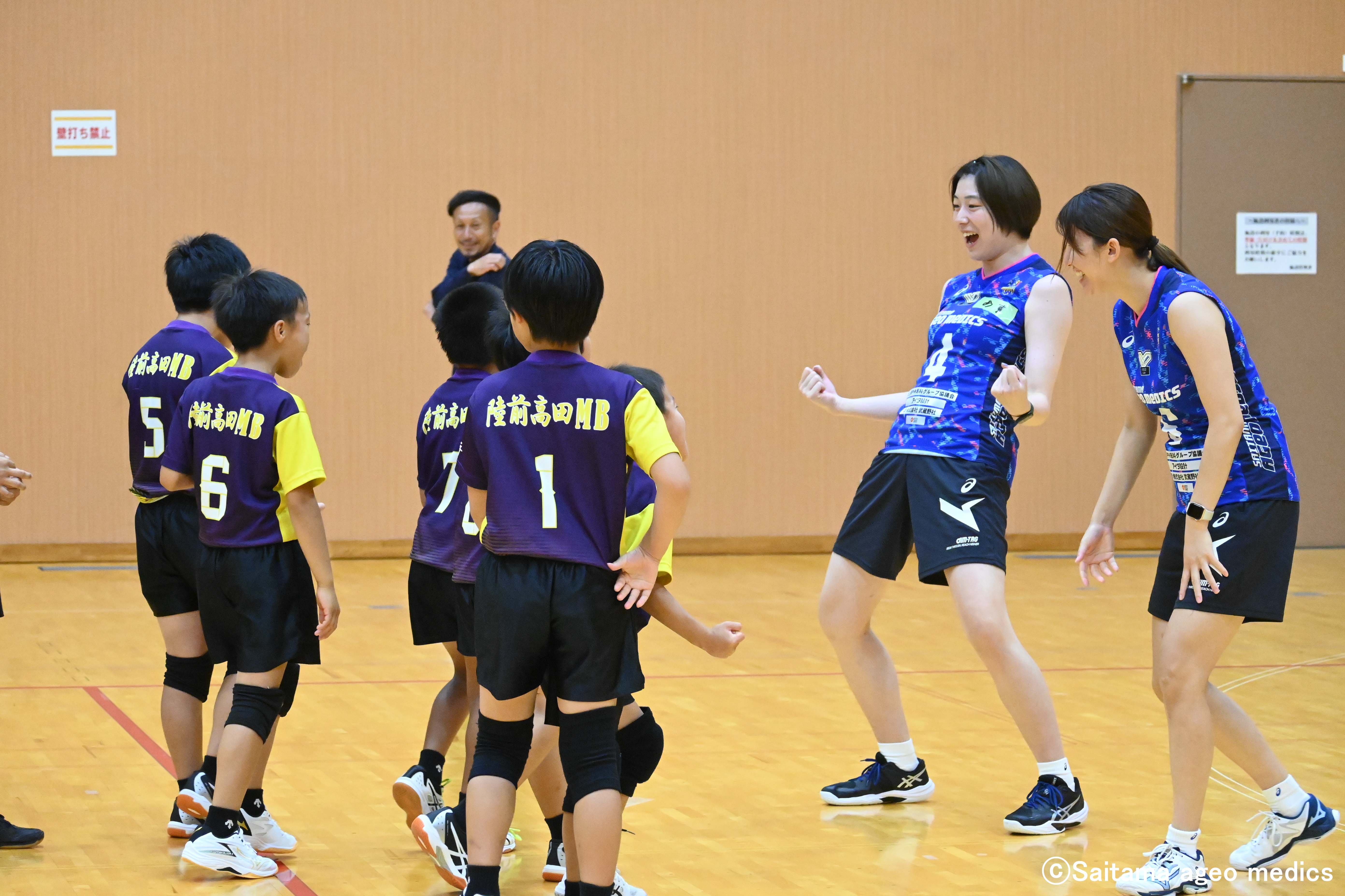 8月1日には、お隣の大船渡市民体育館(岩手県大船渡市)にて地元小学生40名に選手・スタッフがバレーボール教室を行いました。