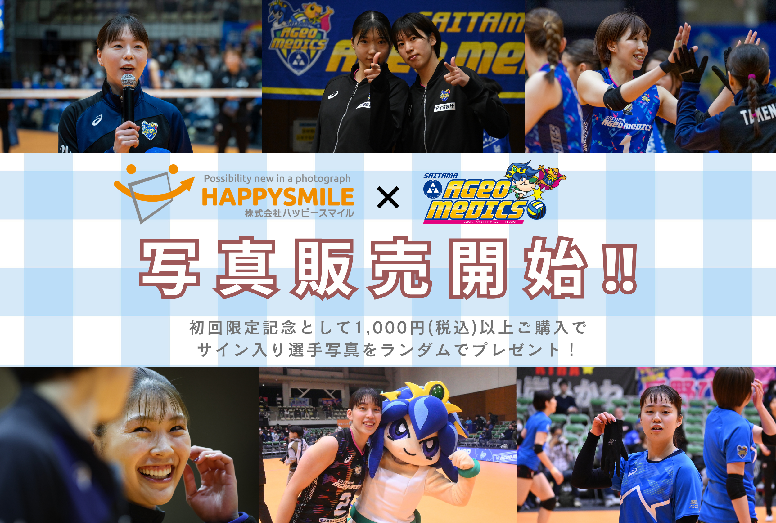 今回は初回販売記念といたしまして、株式会社ハッピースマイル様にご協力いただき1,000円(税込)ご購入ごとに、特典として「サイン入り選手写真(ランダム)」を1枚プレゼントいたします。サイン入り選手写真は全14種類ございますので、14,000円(税込)以上のご購入でコンプリートも可能です。