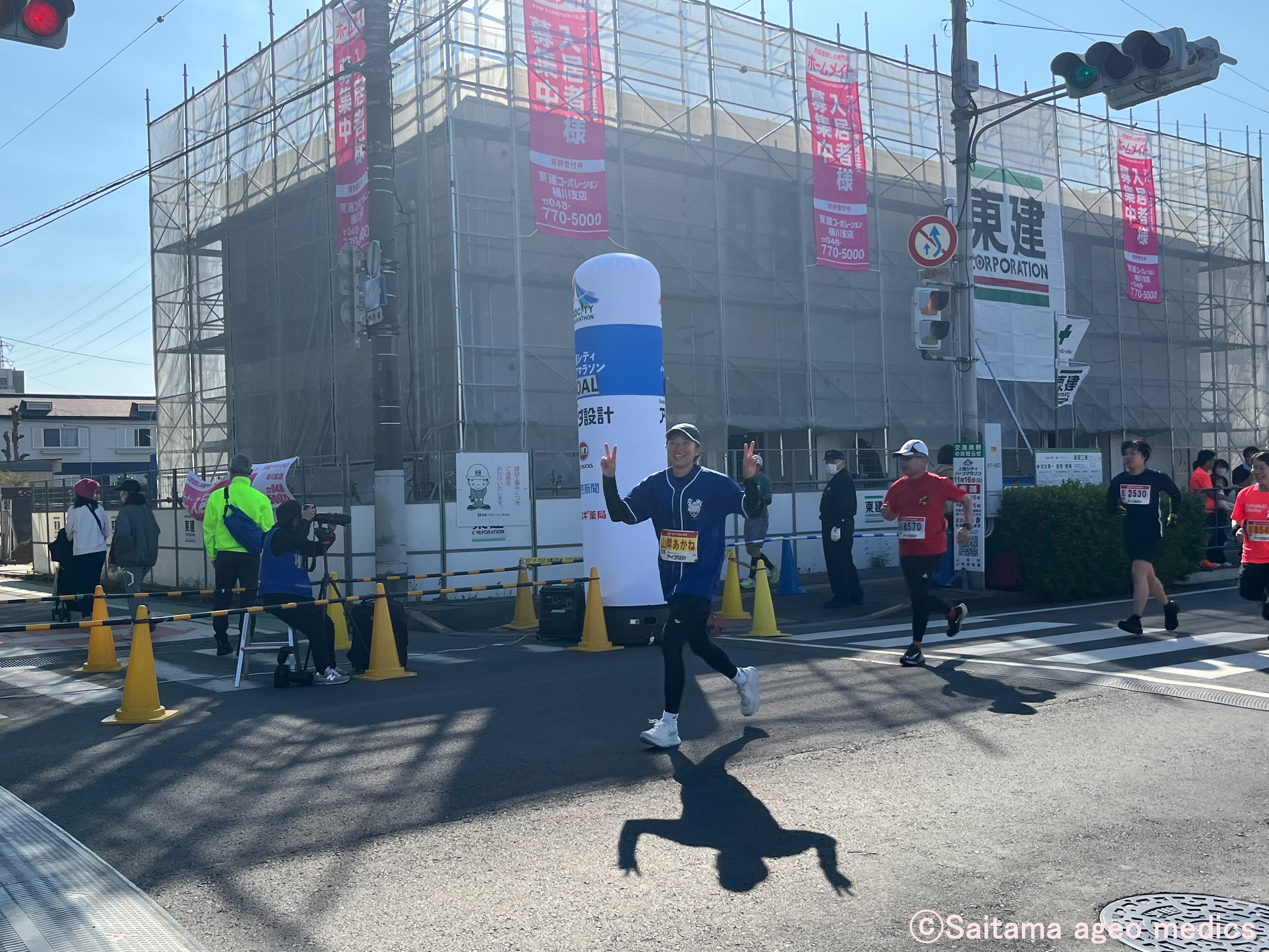 今回の上尾シティハーフマラソンでは、6,655名 のランナーが参加し、山岸さんは沿道の応援に手を振りながら、