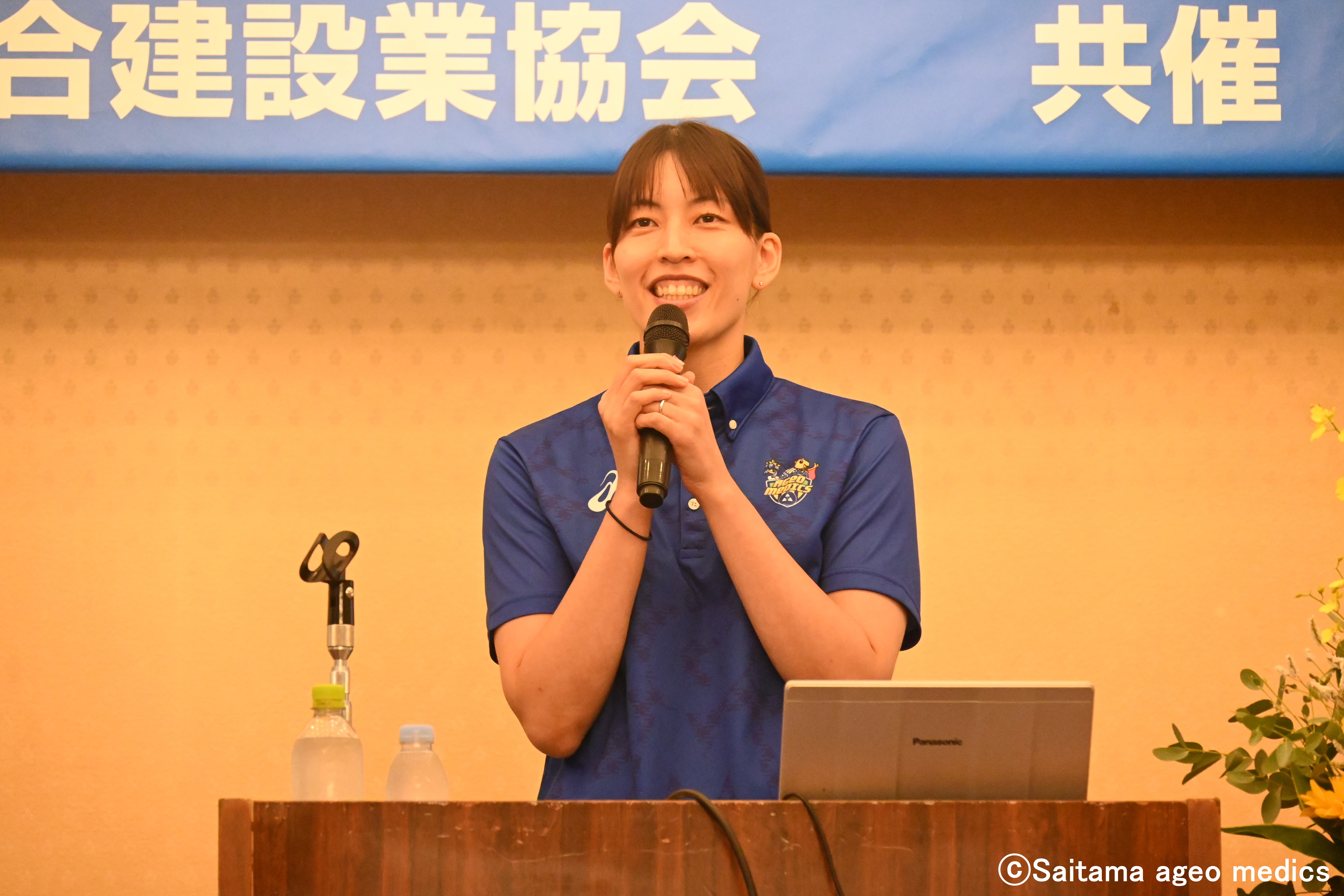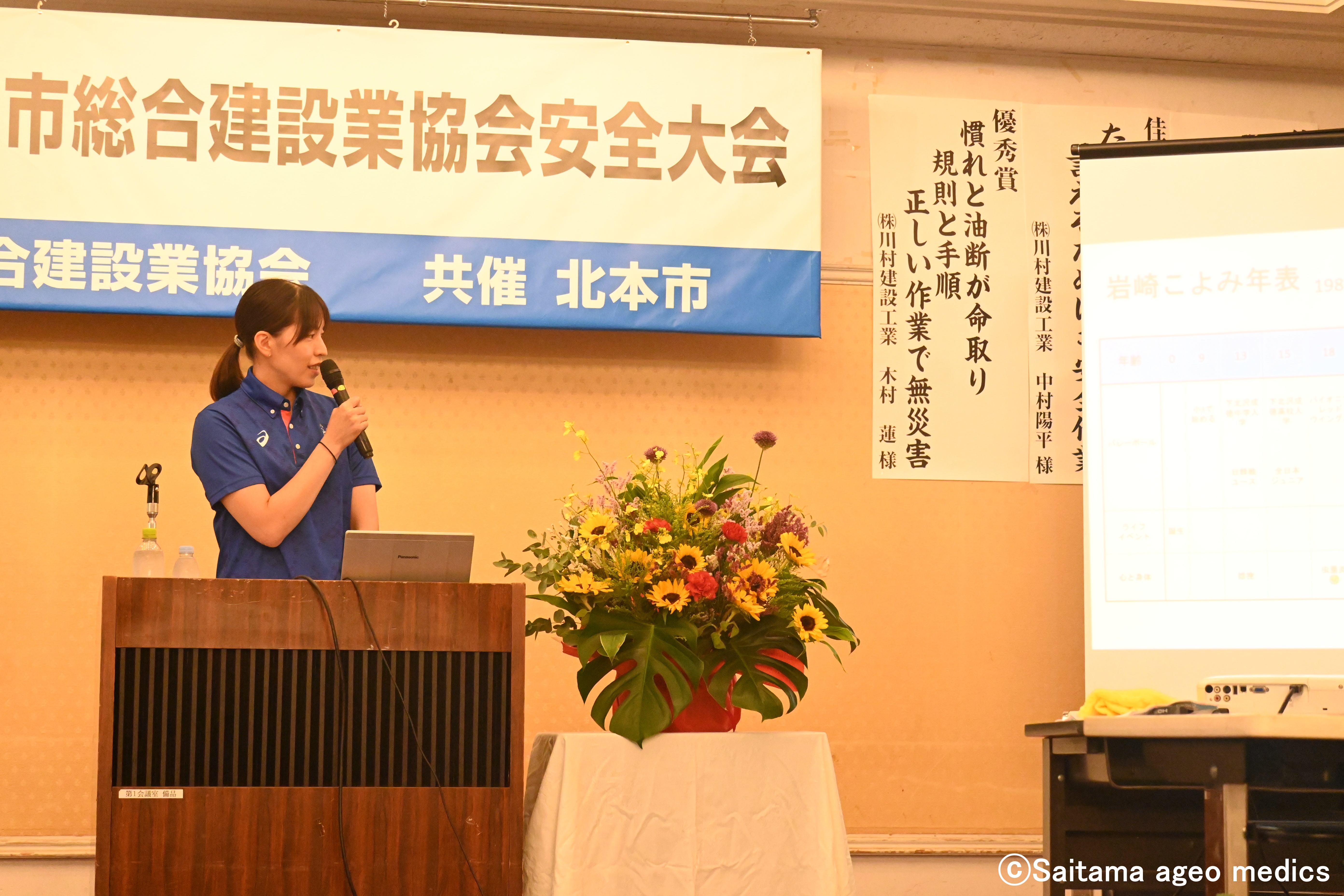 2025年7月17日(木)、北本市総合建設業協会が主催する安全大会にて、岩崎こよみ選手が特別講師として約80名の参加者の前で講演をさせていただきました。