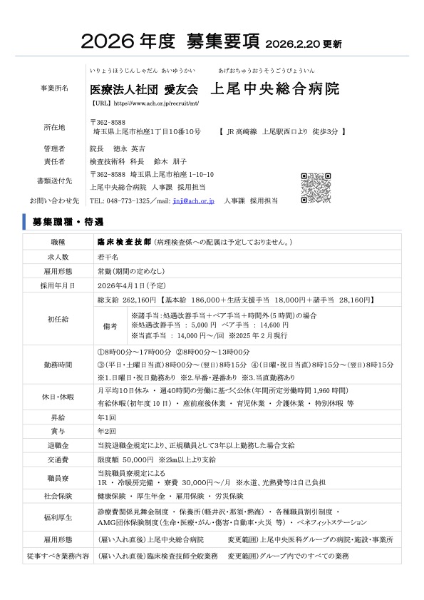 • 上尾中央医科グループの2026年3月卒業予定者向け採用は終了しておりますが、上記に掲載している求人については、現在追加募集を行っております。
