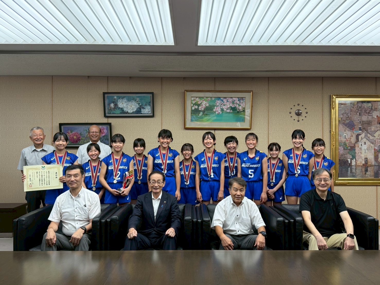 埼玉上尾メディックスから佐藤嗣朗GM、埼玉上尾メディックスJr.(小学生) 三角正敏監督、選手が畠山稔市長に手厚い歓迎を受けました。