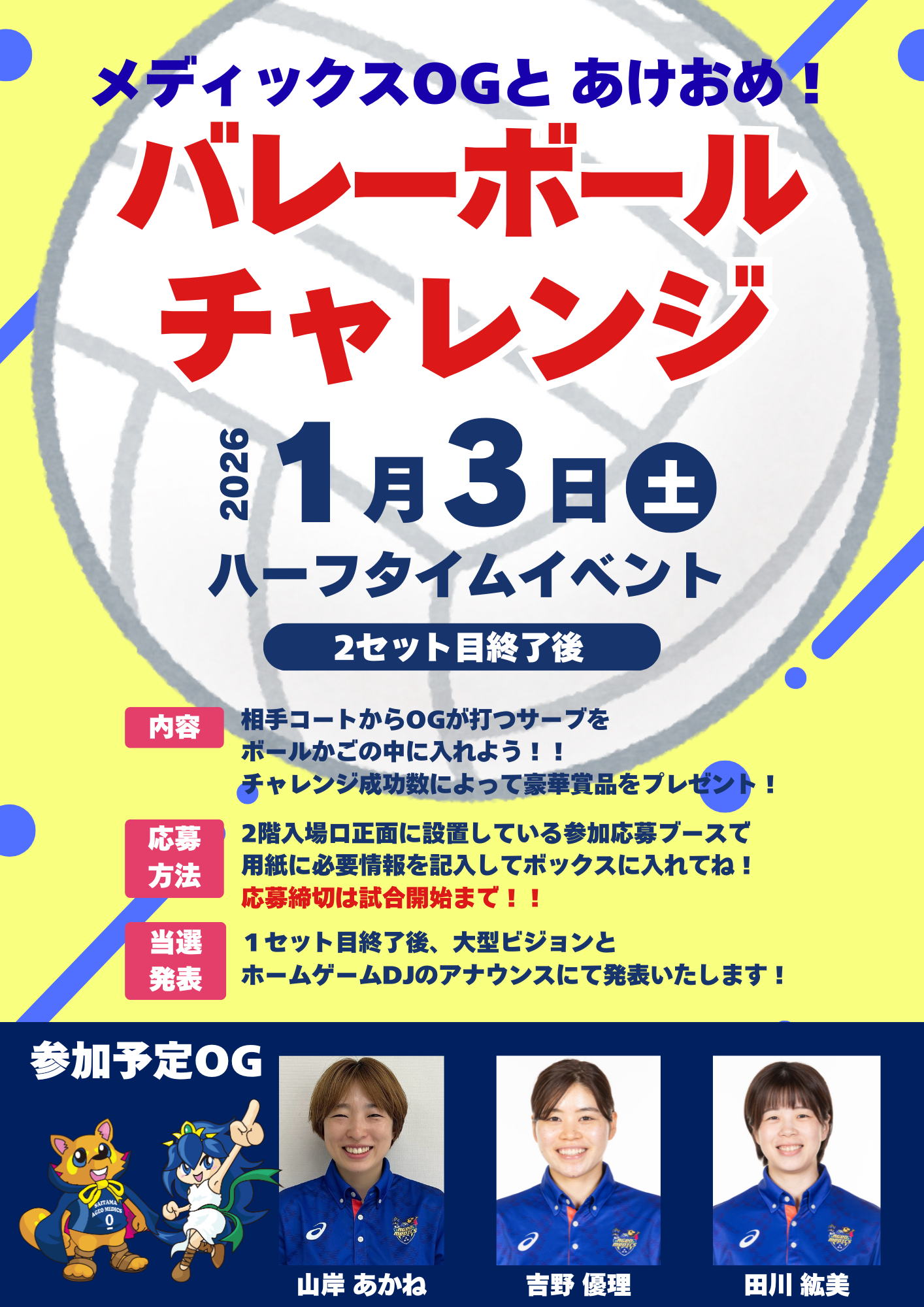 🏐1/3(土)ハーフタイムイベントは「メディックスOGとあけおめ!バレーボールチャレンジ!」